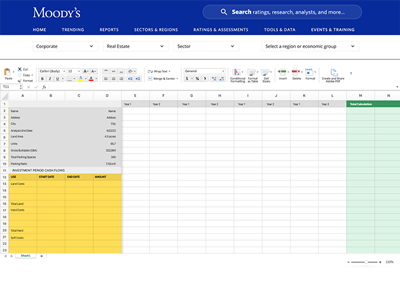 Set information defined by Moody's analytics team is setup on the left with things like property descriptions and operating assesments. The middle area could be expanded and gave users the ablility to plugin information and add columns. Cells are programmed with a formula that will give results within the green area on the far-right side.